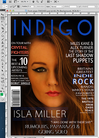 The next step was to add in the title. In order to do this I had to firstly type in the title of my magazine which was Indigo. The next step was to highlight this text and find the text that I had previously downloaded from Dafont.com.